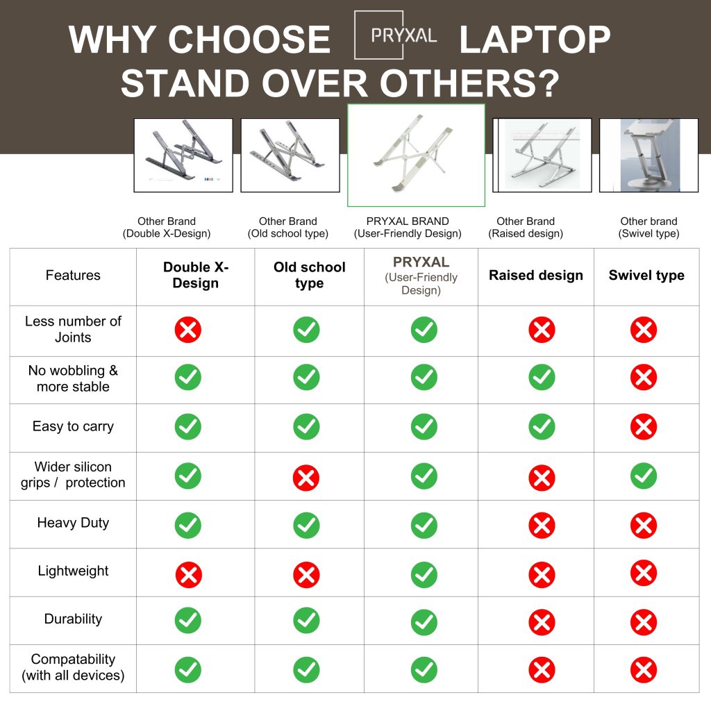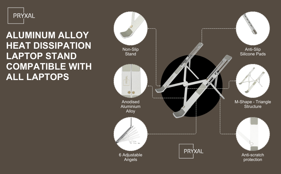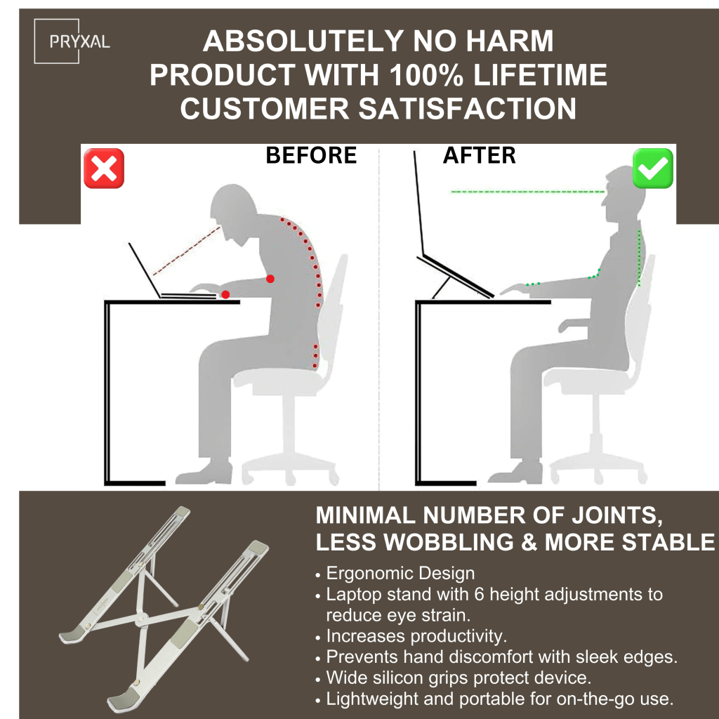 We’re here to help YOU feel awesome! Welcome to PRYXAL, where quality meets comfort! Our premium aluminum laptop stands are designed to improve your posture, reduce strain, and boost productivity. With adjustable angles, a sleek design, and portability, enjoy the perfect blend of durability and elegance. Elevate your workspace today!